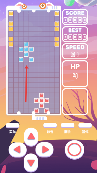 2、操作射擊:用方向鍵控制發(fā)射臺,射擊同色方塊消除,躲避障礙,保護自身(HP顯示)。