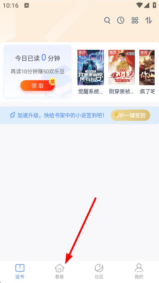 1、打開酷匠閱讀APP,點(diǎn)擊底部導(dǎo)航欄中的看看進(jìn)入書籍瀏覽界面。