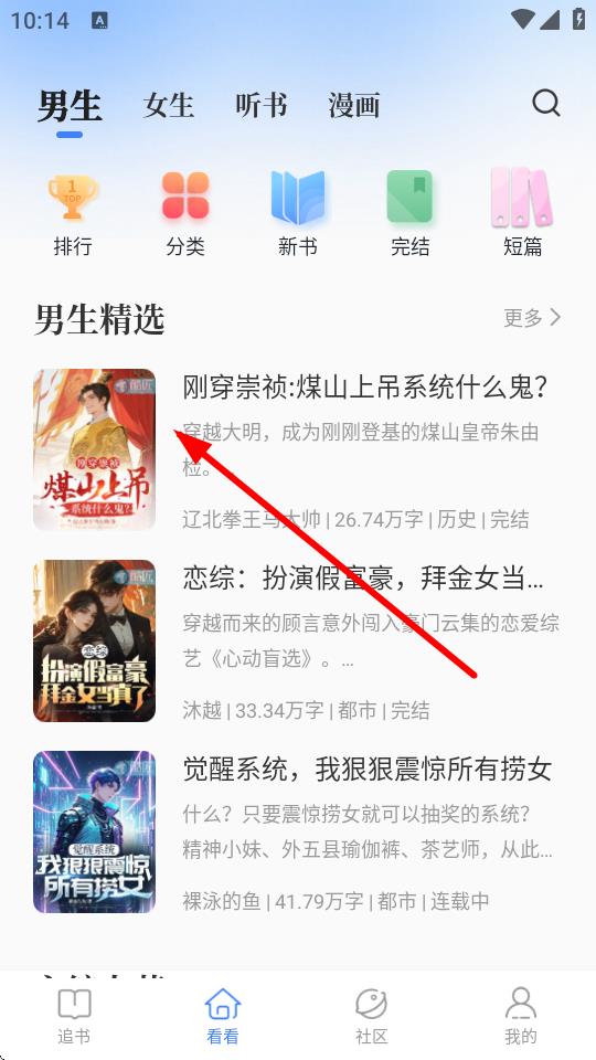 2、在男生精選等板塊中,選擇想要聽的小說,例如剛穿崇禎:煤山上吊系統(tǒng)什么鬼。