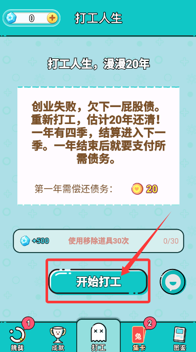 2、在劇情說明頁,了解創(chuàng)業(yè)欠債需20年還清規(guī)則后,點“開始打工”開啟生涯。