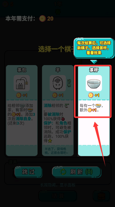 4、結算后在棋子選擇界面,挑選“茶杯”棋子,可助力后續(xù)打工還債進程。