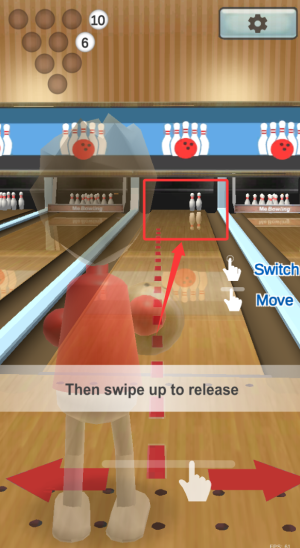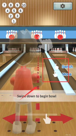 3、通過滑動屏幕投擲保齡球,擊倒球瓶完成得分。