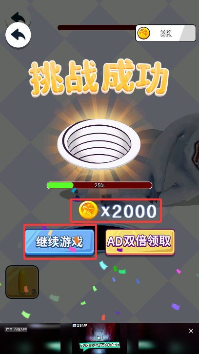 4、闖關(guān)完成后可以獲得大量金幣獎勵,點擊繼續(xù)游戲領(lǐng)取。