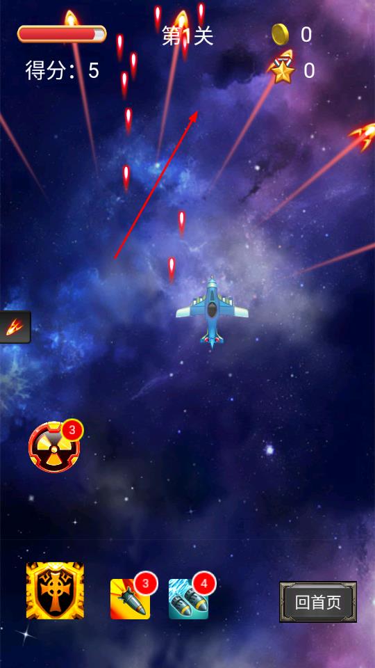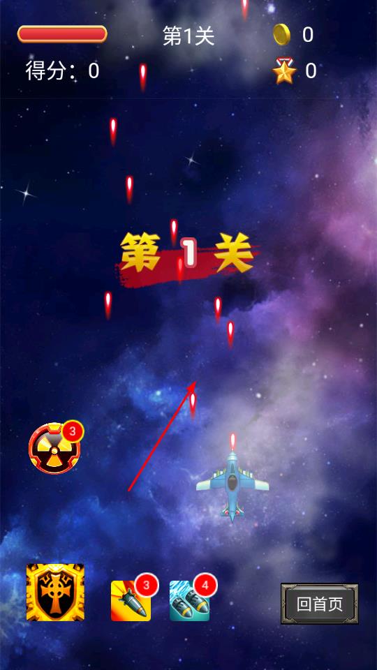 2、在星圖界面點(diǎn)擊【第一關(guān)】進(jìn)入對(duì)應(yīng)關(guān)卡,戰(zhàn)機(jī)自動(dòng)前行,滑動(dòng)屏幕操控方向,點(diǎn)擊屏幕觸發(fā)射擊,規(guī)避迎面而來的彈幕。