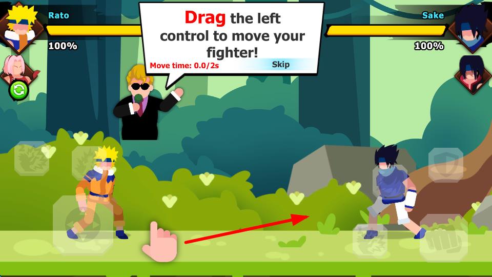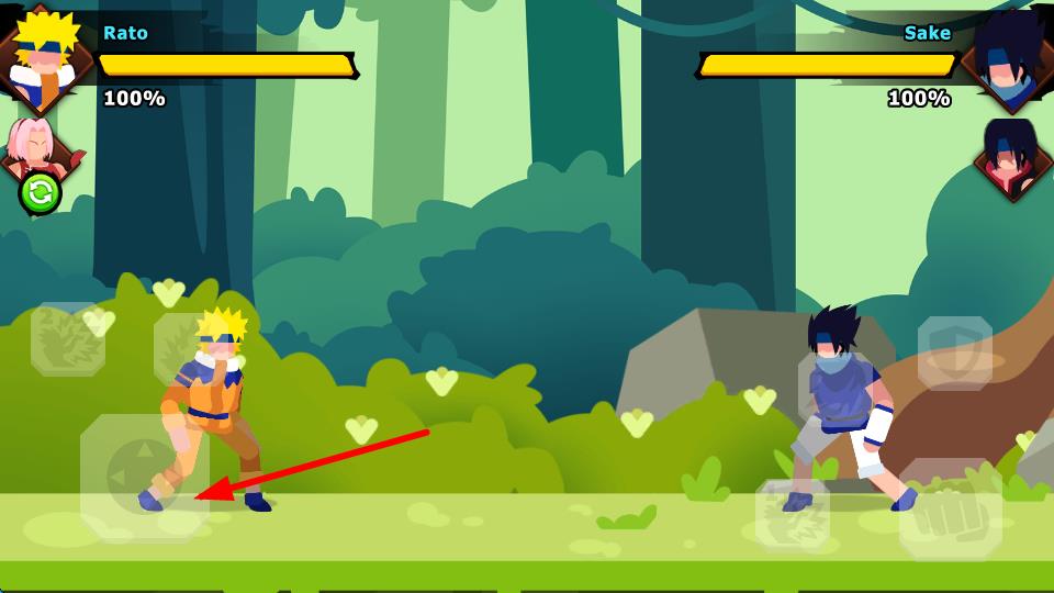 1、進(jìn)入游戲后選擇心儀的火影角色,在格斗場地準(zhǔn)備就緒,通過虛擬按鍵控制角色移動、出拳、踢腿,應(yīng)對對手的初始攻擊。