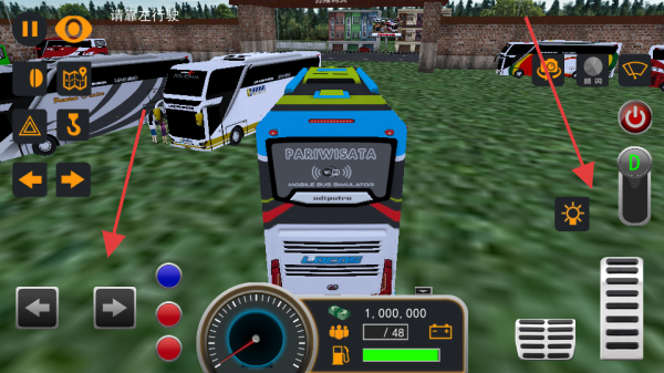 3、進(jìn)入駕駛場景后,利用左下角方向鍵控制巴士轉(zhuǎn)向,通過右側(cè)相關(guān)按鈕進(jìn)行啟動、開關(guān)燈等操作,觀察儀表盤和資金等信息,完成駕駛?cè)蝿?wù)。