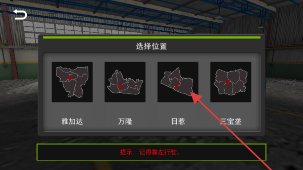 2、在選擇位置界面,點(diǎn)擊箭頭所指的地點(diǎn)(如日惹),確定巴士行駛目的地,準(zhǔn)備開始駕駛?cè)蝿?wù),注意提示信息 “記得靠左行駛”。