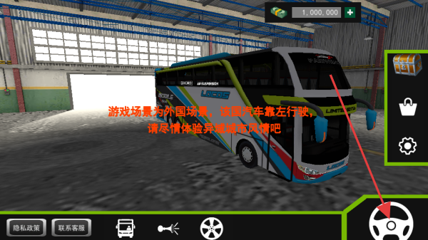 1、游戲場景設(shè)定為外國,需靠左行駛,點(diǎn)擊右下角方向盤圖標(biāo),啟動巴士駕駛操作,屏幕上方顯示初始資金 。