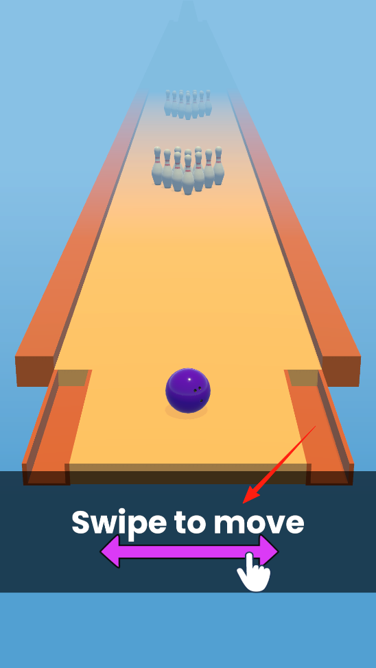 1、進入保齡球游戲界面,按“Swipe to move”提示,滑動屏幕調整紫色保齡球位置,借滑動操作,精準控制球的初始擺放,為擊打瓶陣做準備,體驗基礎的擊球前置策略。