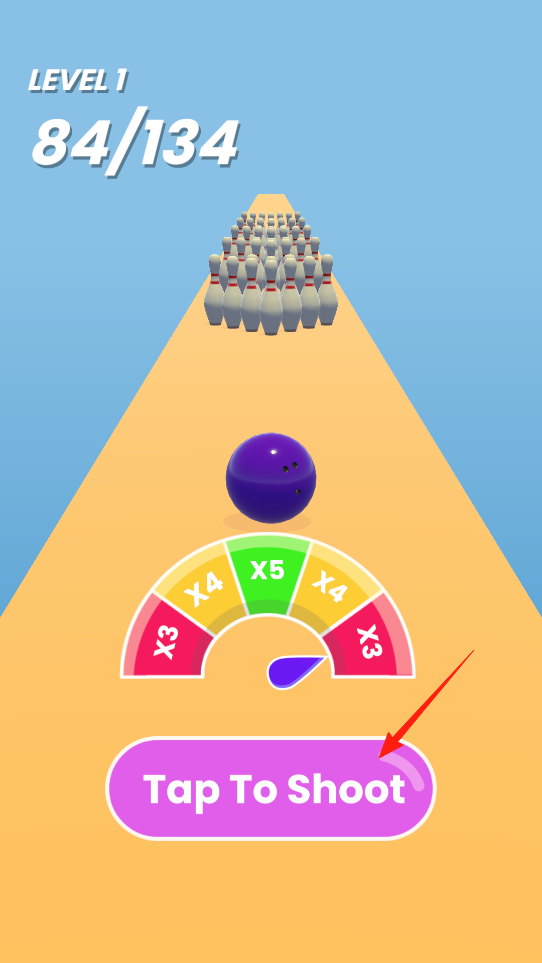 3、球滾動中,出現增益儀表盤,點擊“Tap To Shoot”觸發(fā)強化,借增益觸發(fā)機制,提升擊球效果(如×5倍數),應對更多球瓶挑戰(zhàn),體驗策略性強化與高難度關卡的結合。