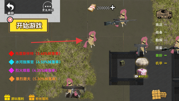 3、進入游戲界面后,點擊【開始游戲】,操控粉色小馬角色,利用武器射擊,可通過“商店”購買裝備,“勘探”了解游戲世界,“裝扮”和機甲”來個性化角色,提升游戲體驗。