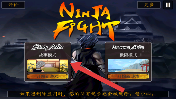 1、有“StoryMode(故事模式)”和“ExtremeMode”兩種模式,可點擊對應【開始新游戲】進入,還提示刪除應用會刪除記錄,需謹慎操作。