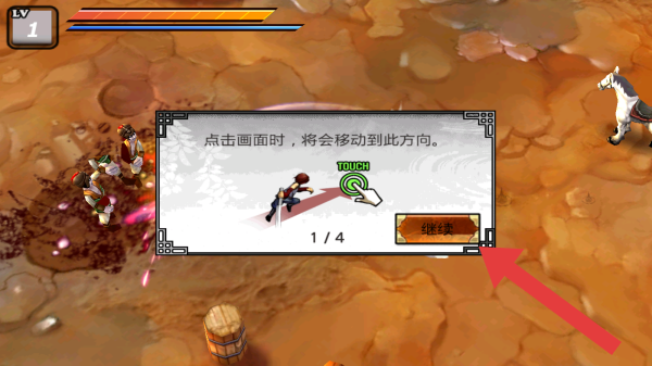 2、角色等級為LV1,提示“點擊畫面時,將會移動到此方向”,當前是第1/4步引導,點擊【繼續(xù)】可進行下一步操作,畫面呈現(xiàn)戰(zhàn)斗場景,有角色、敵人及一匹白馬。