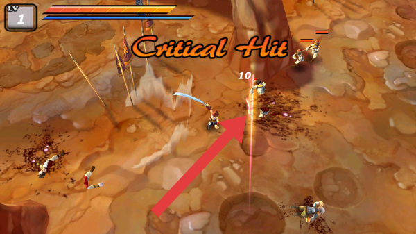3、角色等級為LV1,出現(xiàn)“CriticalHit”(暴擊)字樣,顯示造成10點傷害,畫面中有角色持武器攻擊敵人,呈現(xiàn)戰(zhàn)斗場景。