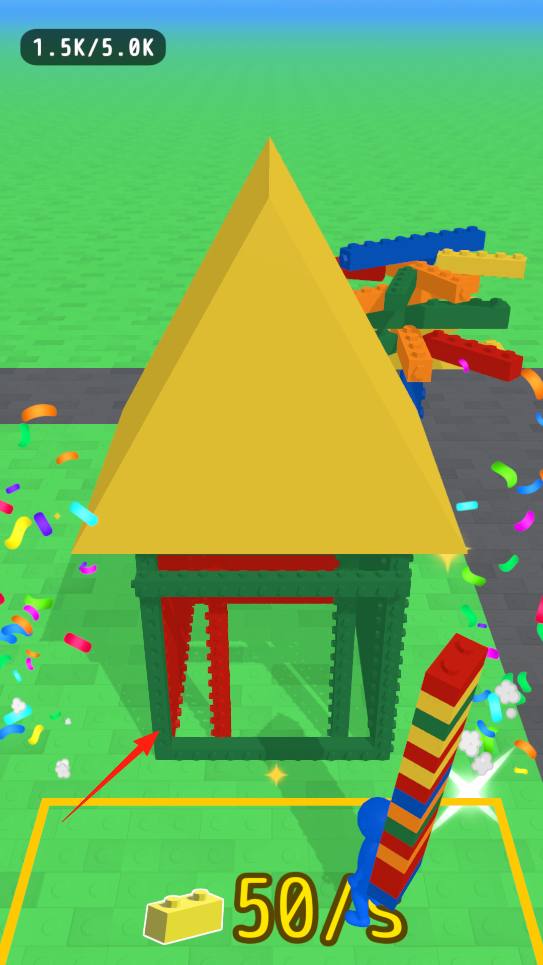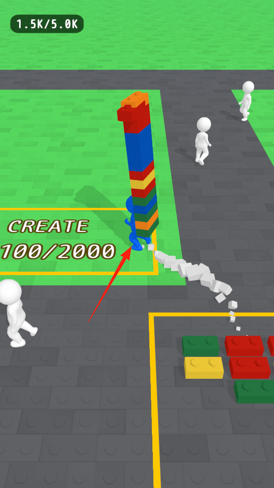 2、操控藍(lán)色角色搬運(yùn)積木,堆疊成高塔,借搬運(yùn)堆疊機(jī)制,積累積木數(shù)量(如1.5K/5.0K),同時(shí)躲避白色角色干擾,感受動(dòng)態(tài)搭建與障礙規(guī)避的結(jié)合。