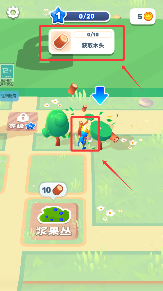 3、先去移動小藍人把樹木伐了獲取木頭。