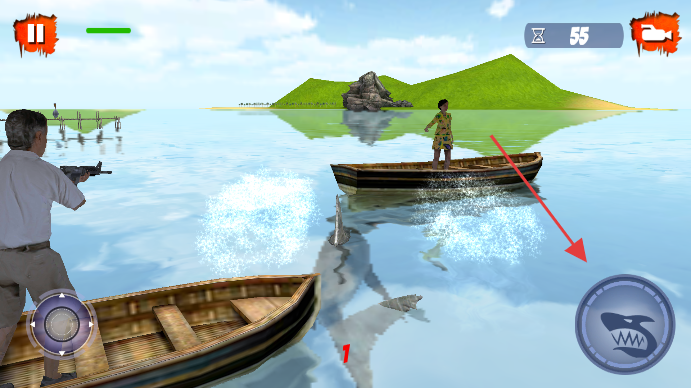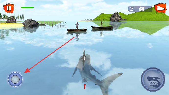 2、左側虛擬搖桿控制鯊魚游動方向,靠近人類。