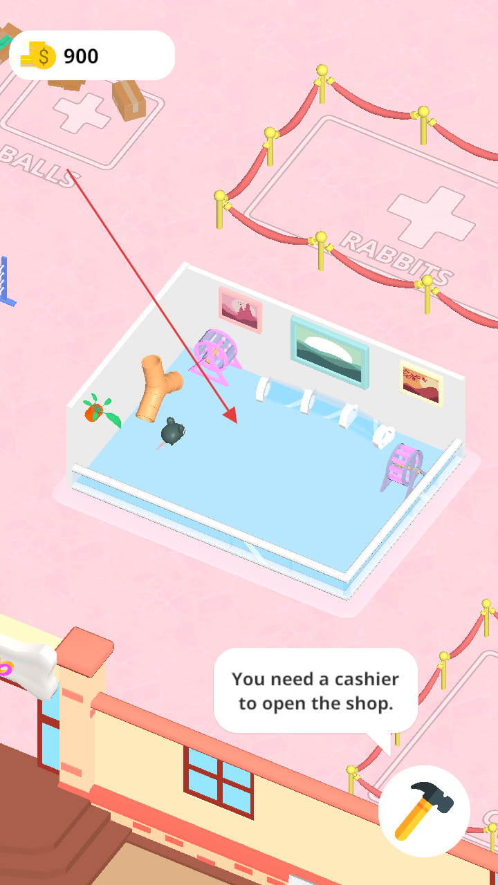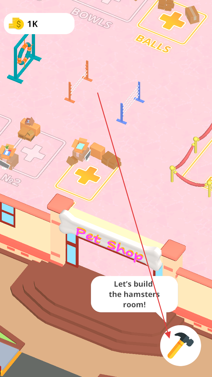 1、進(jìn)入游戲,在寵物店場(chǎng)景(PetShop)中,點(diǎn)擊工具圖標(biāo),開(kāi)展設(shè)施建設(shè)(如建造倉(cāng)鼠房間)。