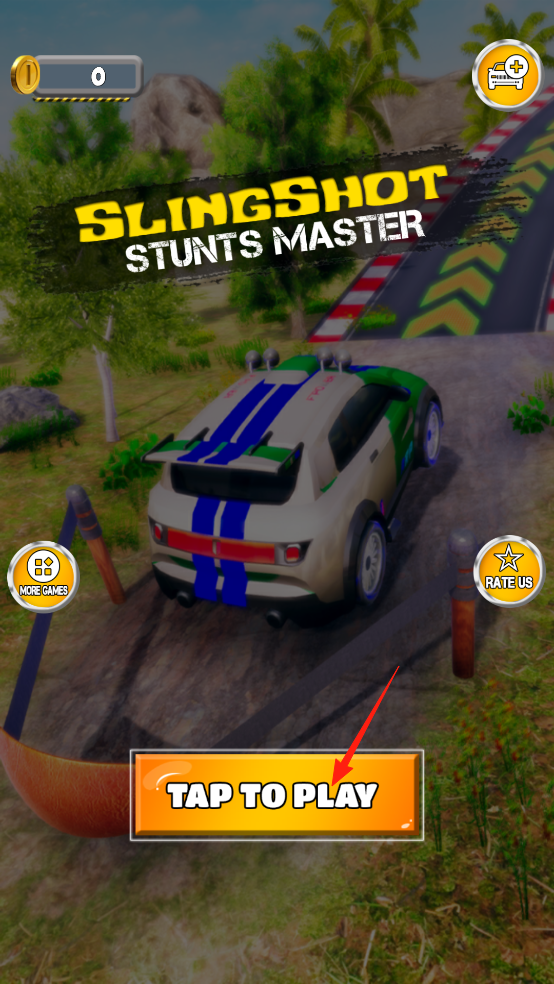 1、在游戲主界面,點擊“TAP TO PLAY”,讓賽車進(jìn)入彈弓發(fā)射裝置,借彈射機(jī)制,為特技挑戰(zhàn)做準(zhǔn)備,感受賽車即將被強(qiáng)力發(fā)射的緊張感,開啟特技競速之旅。