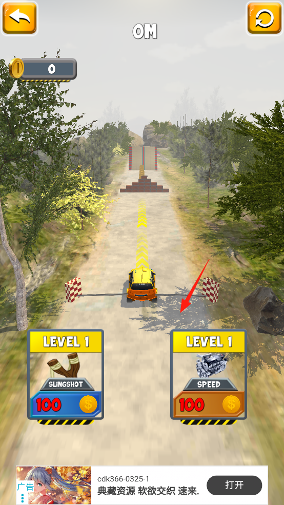 2、進(jìn)入關(guān)卡,在賽車出發(fā)前,選擇“SLINGSHOT”或“SPEED”強(qiáng)化,借賽前強(qiáng)化機(jī)制,消耗金幣提升彈射或速度屬性,定制賽車性能,為跨越障礙、完成特技助力。