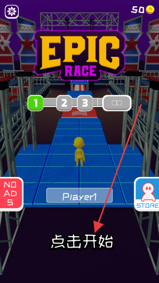 1、點(diǎn)擊【點(diǎn)擊開(kāi)始】,進(jìn)入【EPIC RACE】【1】階段,操控角色,開(kāi)啟競(jìng)速挑戰(zhàn)。