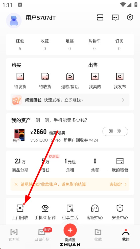 1、打開轉(zhuǎn)轉(zhuǎn)APP,進(jìn)入個(gè)人中心,點(diǎn)擊上門回收選項(xiàng)。