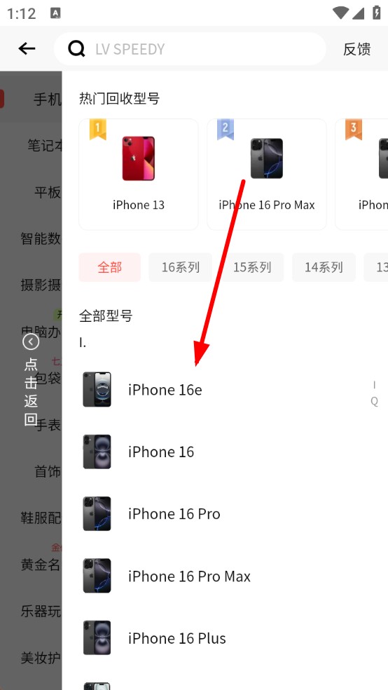 2、在回收型號(hào)選擇頁面,找到并選定要回收的手機(jī)具體型號(hào)。