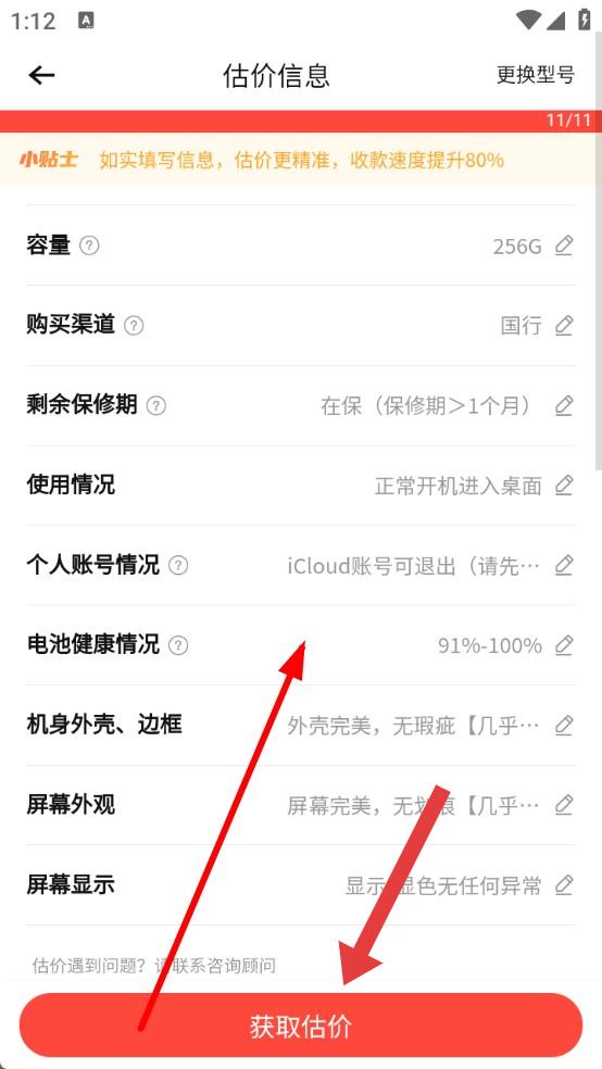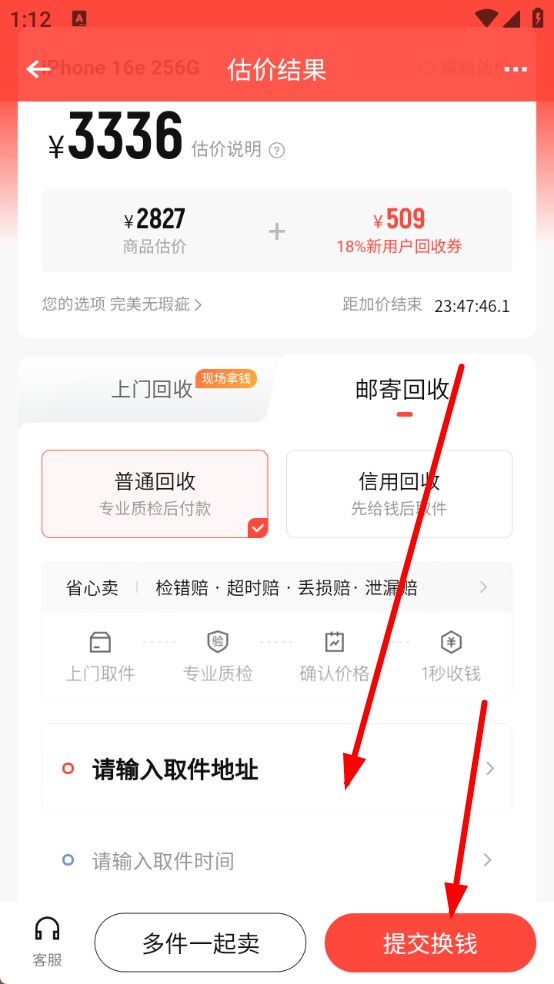 4、在估價(jià)結(jié)果頁選上門回收,輸入取件地址、取件時(shí)間,點(diǎn)擊提交換錢即可。