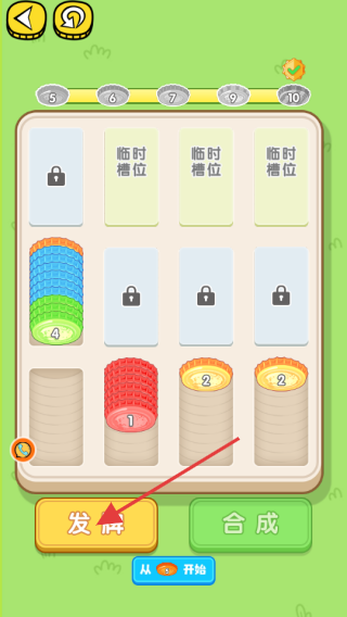 3、在關(guān)卡中,點(diǎn)擊【發(fā)牌】,獲取金幣,按規(guī)則堆疊(如相同數(shù)字合成),利用“合成”功能升級(jí)金幣,完成關(guān)卡目標(biāo),推進(jìn)游戲進(jìn)程,體驗(yàn)解壓消除樂趣。