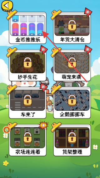 2、選擇【金幣推推樂】,進(jìn)入對(duì)應(yīng)關(guān)卡,點(diǎn)擊箭頭提示區(qū)域,開始金幣堆疊挑戰(zhàn)。
