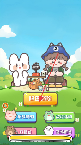 1、點(diǎn)擊【解壓消除】,進(jìn)入玩法選擇界面,可體驗(yàn)“金幣推推樂”“年貨大清倉(cāng)”等模式,還有“無(wú)敵腦洞”“放松休閑”等分類。