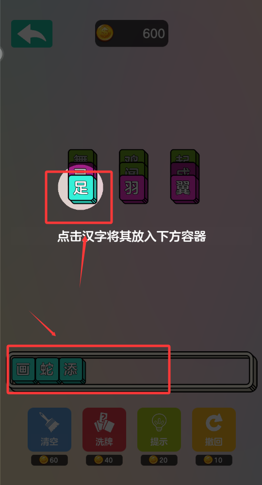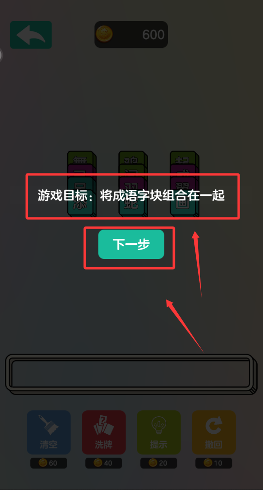 3、看游戲的提示將成語字塊組合一起。