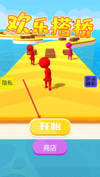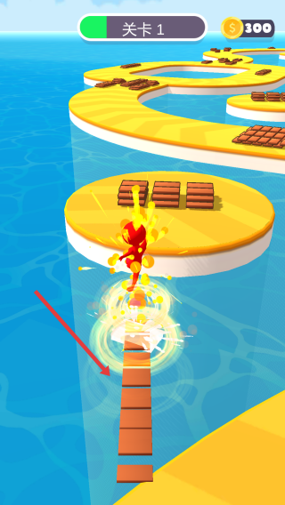1、點擊“開始”進入關卡1,操控紅色小人在黃色跑道奔跑,沿途收集木板。