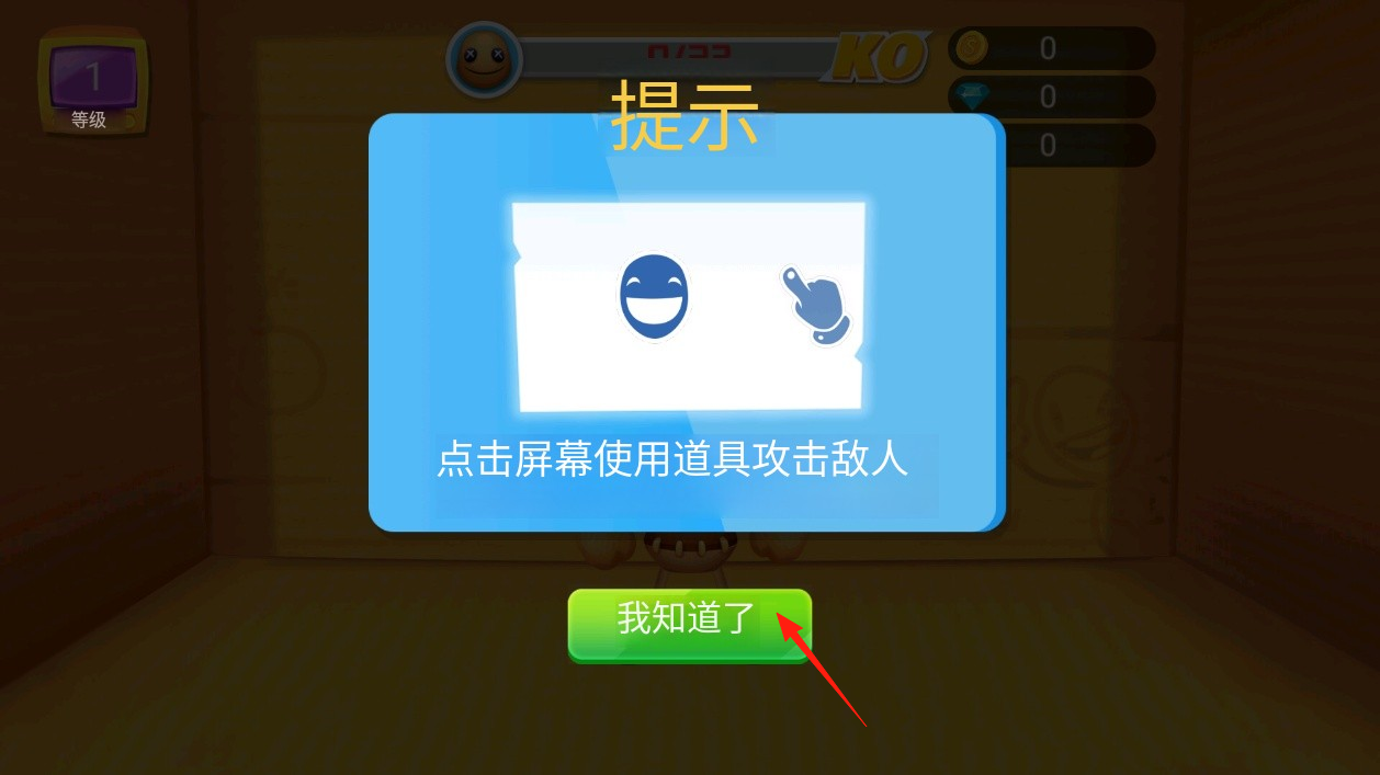1、進入無敵木頭人,在彈出的提示框,點“我知道了”,接下來就能用點擊屏幕的方式,召喚道具揍敵人啦,準(zhǔn)備去和敵人過過招,開啟戰(zhàn)斗小旅程。