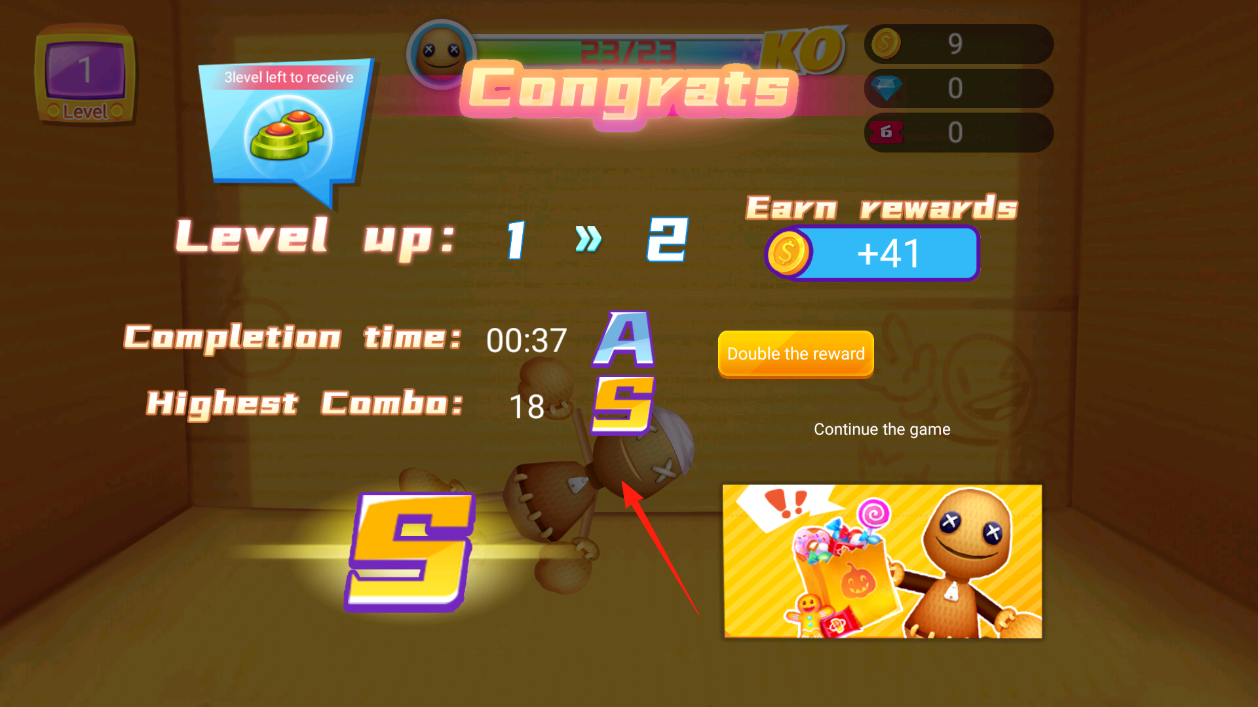 3、打完敵人,彈出結(jié)算界面,咱成功升級還拿到獎勵,想繼續(xù)玩就點【Continue the game】,接著去挑戰(zhàn)下一波敵人,把這種戰(zhàn)斗爽感延續(xù)下去。