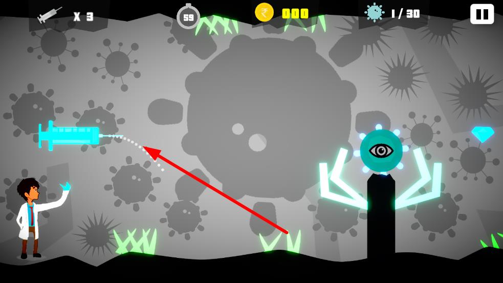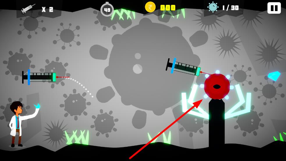1、畫(huà)面左側(cè)角色持有注射器,界面顯示注射器數(shù)量、倒計(jì)時(shí)、金幣數(shù)和需消滅病毒目標(biāo),點(diǎn)擊可發(fā)射注射器攻擊病毒。