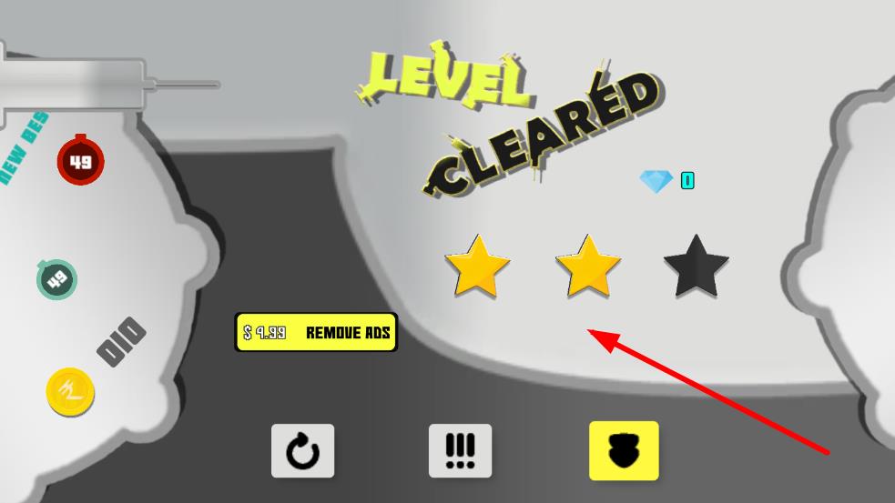3、成功消滅目標(biāo)病毒后,進(jìn)入“LEVEL CLEARED”關(guān)卡結(jié)算界面,展示星級(jí)評(píng)價(jià)、鉆石獲取情況,可選擇繼續(xù)游戲或重新游玩本關(guān)卡。