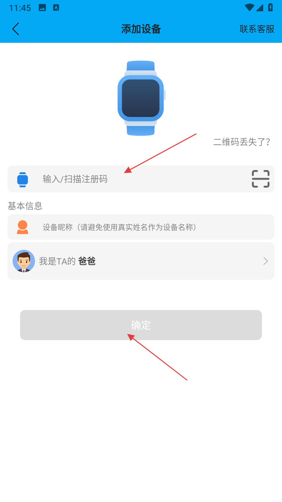 3、在添加設(shè)備頁面,點擊輸入或掃描注冊碼的輸入欄,輸入電話手表機(jī)身上的注冊碼,接著設(shè)置設(shè)備昵稱,選擇與設(shè)備使用者的關(guān)系,最后點擊確定按鈕完成綁定。