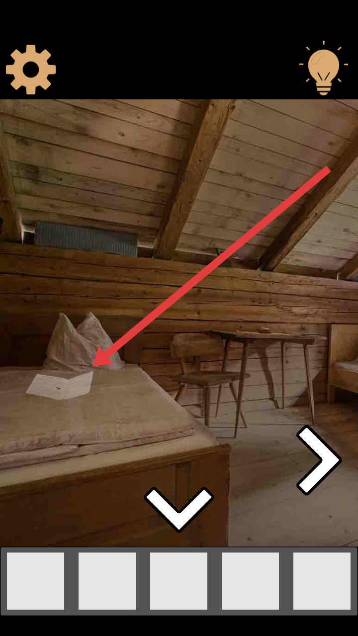 1、進(jìn)入逃出記憶中的山間小屋游戲后,身處于閣樓場(chǎng)景,需要點(diǎn)擊床上的紙張,獲取初始解謎線索。