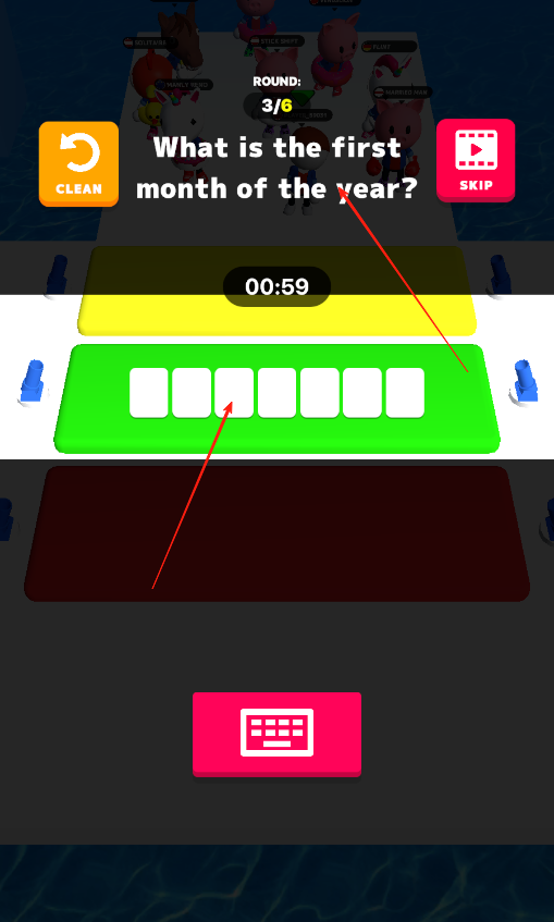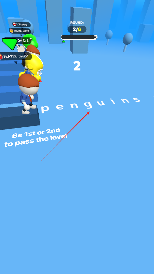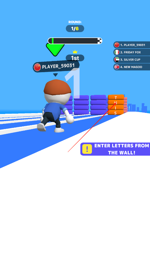2、當(dāng)?shù)谝魂P(guān)結(jié)束,淘汰一批玩家之后,則會進(jìn)入第二關(guān)卡,當(dāng)前關(guān)卡需要根據(jù)前方英文打字,才能出現(xiàn)前進(jìn)的方塊。