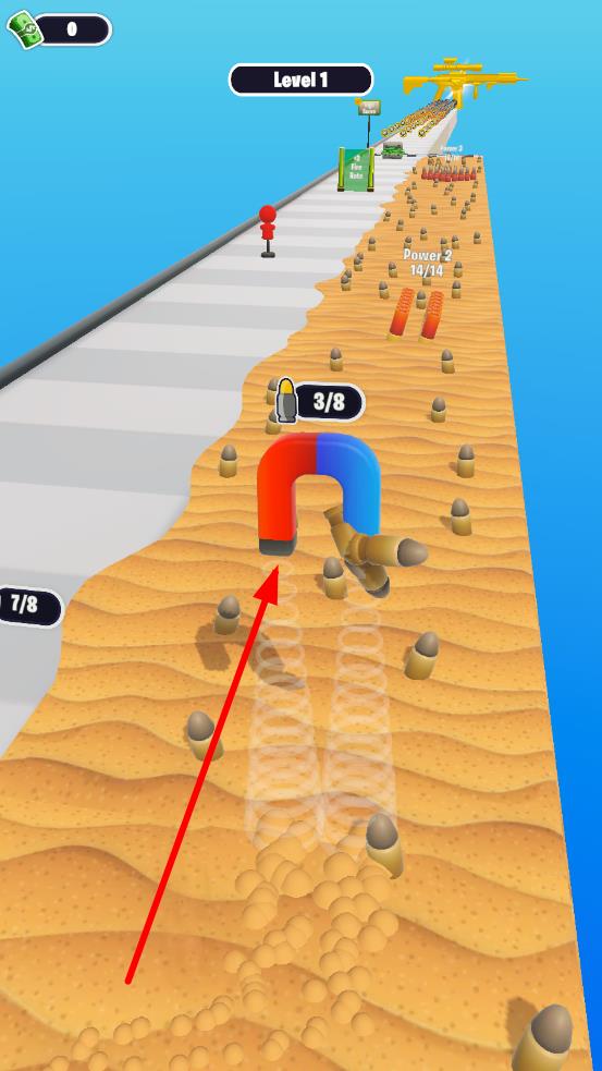 1、Level1初始場(chǎng)景,在藍(lán)色背景跑道起點(diǎn),操控帶磁鐵等道具武器前行,沿途收集子彈、特殊道具,并且留意路邊提示標(biāo)識(shí)。