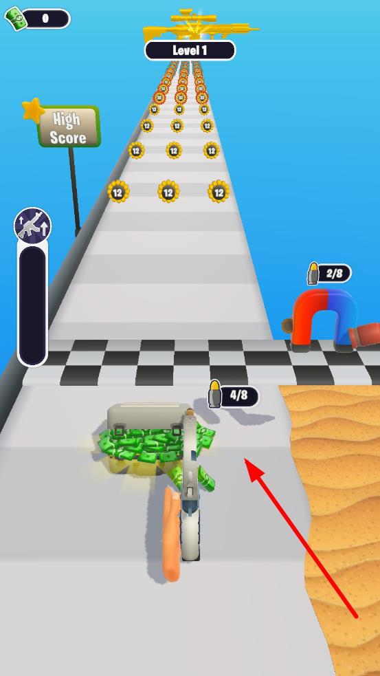 2、跑酷射擊進(jìn)程,磁鐵吸附完子彈后,左滑將子彈給到手槍,手槍進(jìn)行設(shè)計(jì),途經(jīng)“High Score”區(qū)域,沖向黑白格終點(diǎn)線。