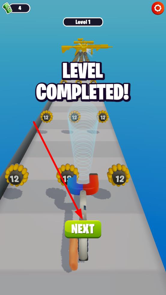 3、成功抵達(dá)終點(diǎn),界面顯示“LEVEL COMPLETED!”,點(diǎn)擊綠色“NEXT”按鈕,進(jìn)入下一關(guān)新挑戰(zhàn),使用金幣對(duì)于手槍和磁鐵進(jìn)行升級(jí)。