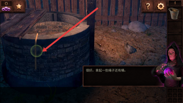 2、進入井邊場景,按指引拿起繩子和桶,完成物品的收集,為打水做好準備,繼續(xù)后面的任務(wù)。