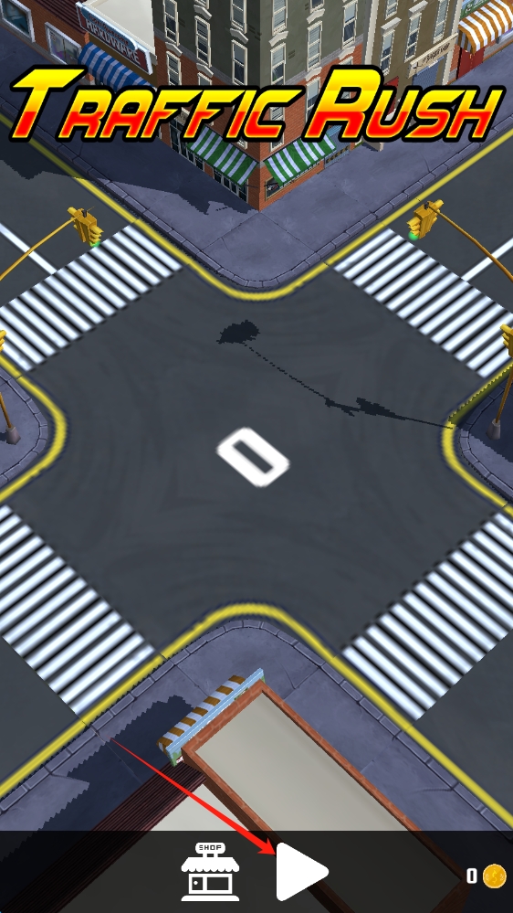 1、游戲標(biāo)題界面,呈現(xiàn)城市路口場(chǎng)景,有 “SHOP”(商店 )和播放按鈕,點(diǎn)擊開始游戲。