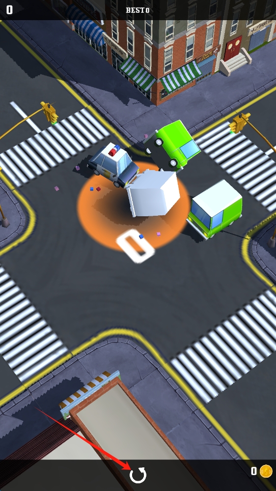 2、游戲失敗畫面,路口發(fā)生車輛碰撞,顯示 “BESTO”(可能是成績(jī)統(tǒng)計(jì) ),底部有重玩按鈕,點(diǎn)擊重開游戲。