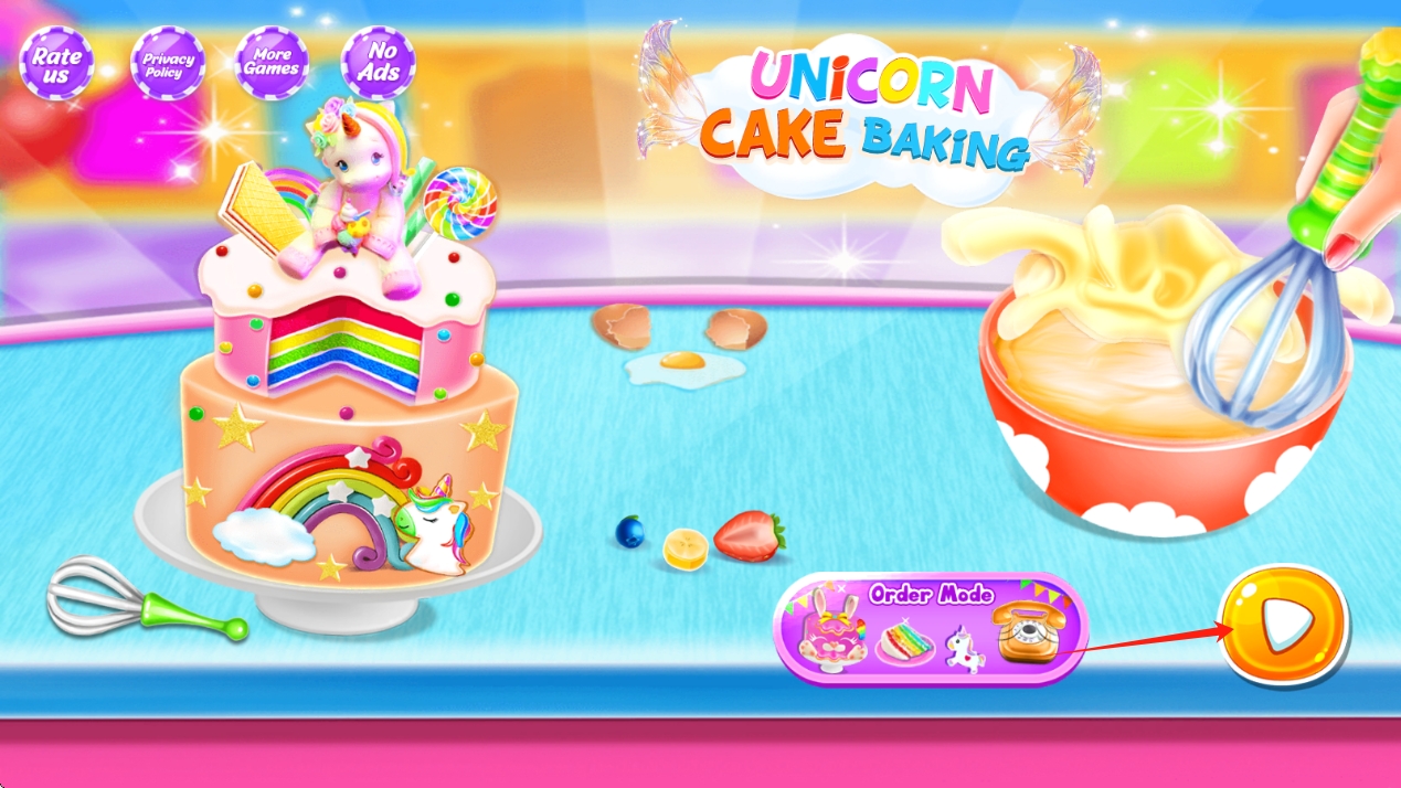 1、游戲標(biāo)題界面,展示烘焙好的獨角獸主題蛋糕,有 “Rate us”(評分 )、“Privacy Policy”(隱私政策 )等按鈕,點擊開始游戲。
