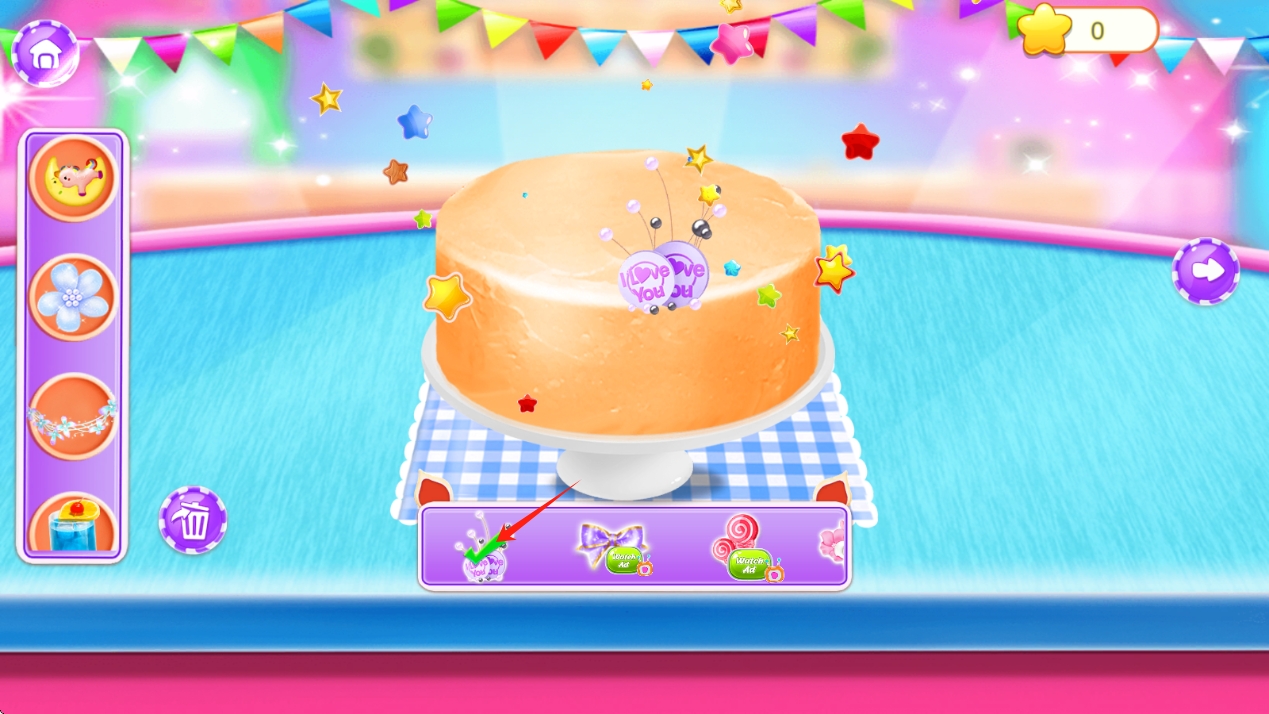 2、蛋糕裝飾環(huán)節(jié),顯示已涂抹奶油的蛋糕,左側(cè)有裝飾素材(獨角獸、花朵等 ),底部有裝飾選項,點擊使用道具。