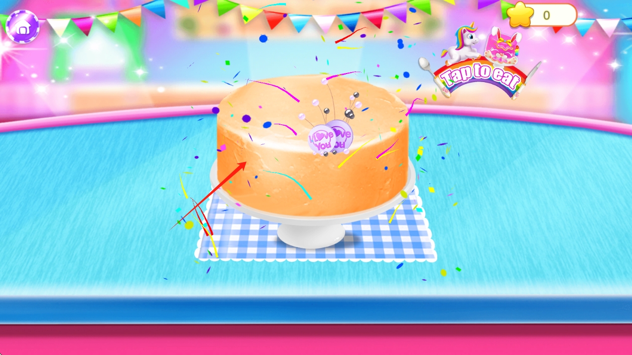 3、裝飾完成畫面,蛋糕呈現(xiàn)最終效果,有 “Tap to eat”(點擊食用 )提示,灑落彩帶營造慶祝氛圍,點擊查看。