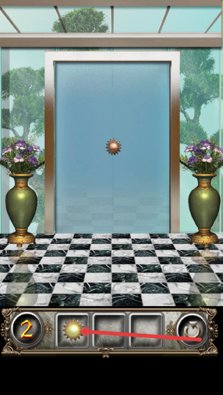 2、根據(jù)指示進(jìn)入第二場景,根據(jù)箭頭的方向,將道具欄中太陽狀物品點(diǎn)擊移動至門中央,激活機(jī)關(guān),解鎖開門。
